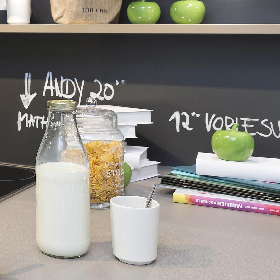 Vielleicht haben ja auch Sie ein geeignetes Stück freier Wand in der Küche? Die Rede ist vom "Schwarzen Brett" – nur ohne Brett ;-), stattdessen einfach mit Farbe. Voraussetzung ist natürlich, dass die Wand untapeziert ist, idealerweise verputzt, ohne Rigips. Andernfalls brauchen Sie doch ein extra Brett. Das oder die Wand lässt sich nämlich mit Tafelfarbe in eine Tafel verwandeln, auf die man mit Kreide schreiben kann.